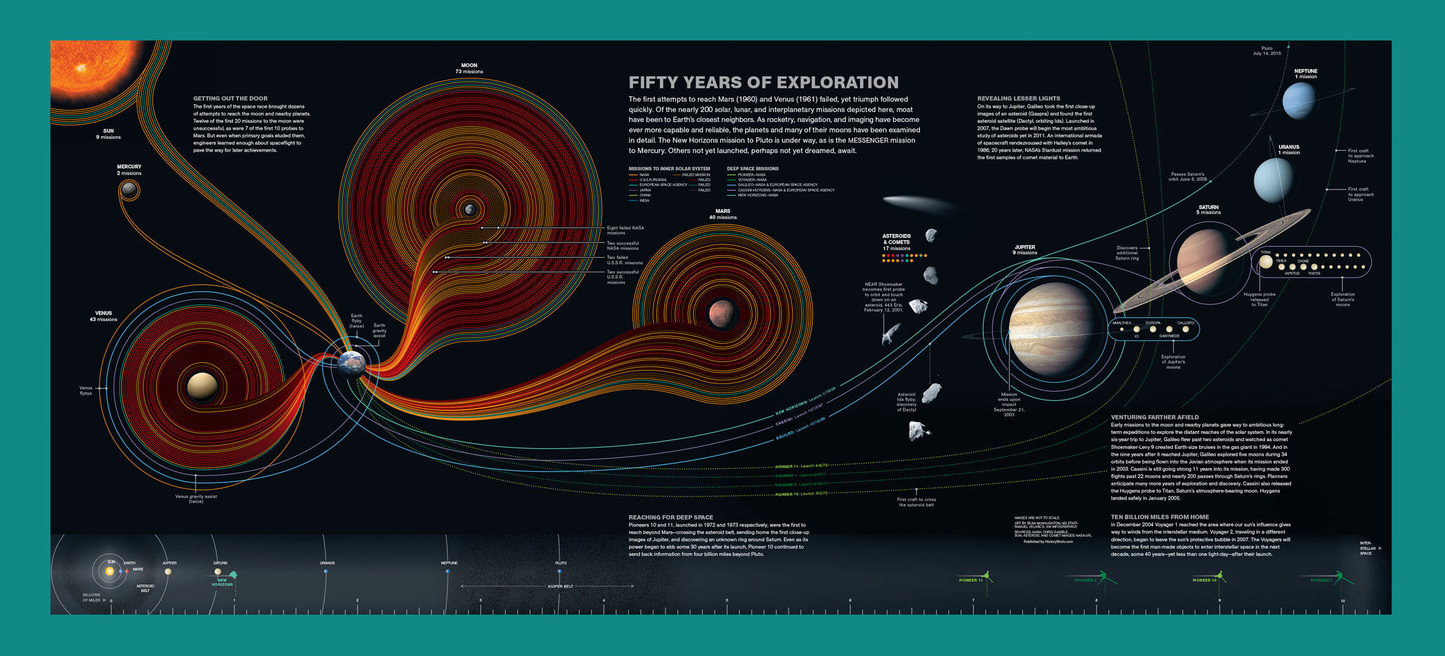Art and information are beautifully combined in this stunning visual of space exploration. Two hundred space missions are depicted across our solar system and beyond. Given our desire to explore the universe it is insightful to see that most exploratory missions have been limited to our closest neighbors -- the moon, Mars and Venus.