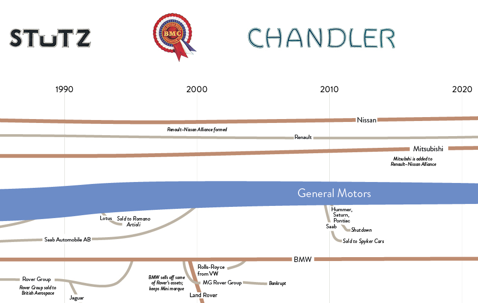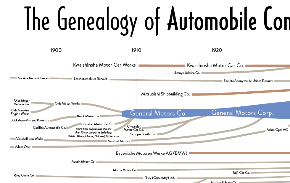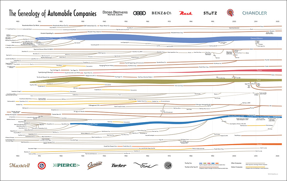 130 years of visual history of more than 100 car companies across the span of the automobile industry. From 1900 to 1925 over 3,300 organizations were formed to produce automobiles in the United States. Today, ten companies account for about 90% of all US automobile sales. Genealogy of Automobile Companies is a visual history of this fascinating industry from the Big Five to the small defunct companies. Folded into the genealogy is the relative market share of US sales for each company.