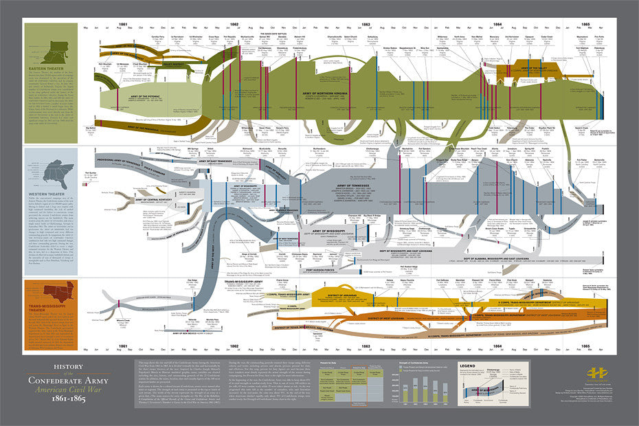 Follow the rise and fall of the Confederate Army during the American Civil War. There are countless books and maps about the Civil War but there is nothing that provides a single visual picture of the conflict like this award winning chart. The History of the Confederate Army charts 100 of the most important battles along with the history of the Army of Northern Virginia, Army of Tennessee, and 21 other armies. Divided vertically by date and horizontally by the three major theaters of the war, the graphic maps many dimensions including the size, history, and commanding generals of each force. In addition, the name, location, date, casualty figures and who won the most important battles are provided.