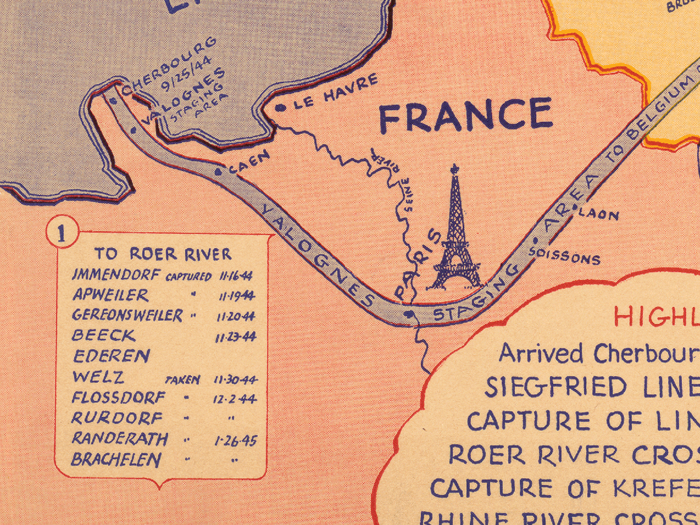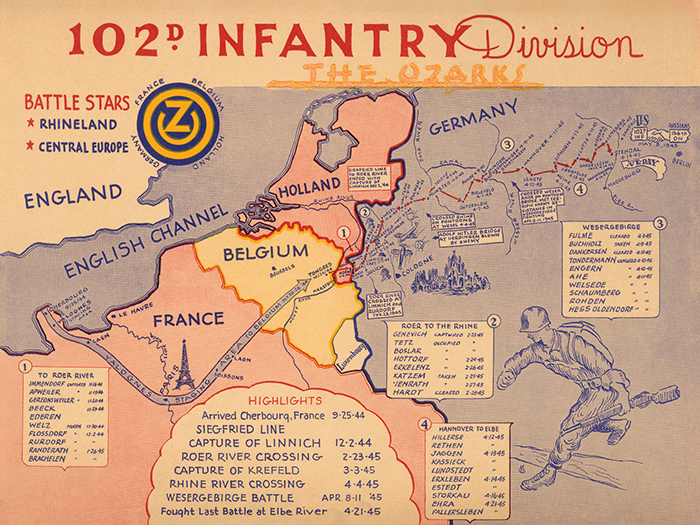 Campaigns of the 102nd Infantry Division is a detailed World War II route map of the Ozark Division during World War II. The map shows the route taken by the 102nd Division from its landing at Cherbourg, France to V.E. Day in Germany including the link-up with Russian forces. Printed text lists the towns the 102nd Division passed through and the dates they were cleared, taken, captured, and occupied. Important highlights such as critical river crossings are also detailed.