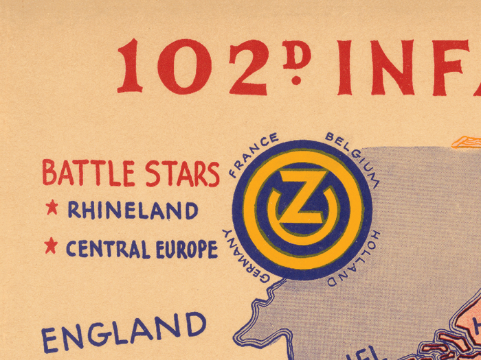 The 102nd Infantry arrived in France on September 23, 1944, and, after a short period of training near Valognes, moved to the German-Netherlands border. On October 26th, elements attached to other divisions entered combat and on November 3rd the division assumed responsibility for the sector from the Wurm River to Waurichen. The division fought in the Rhineland and Central Europe campaigns.