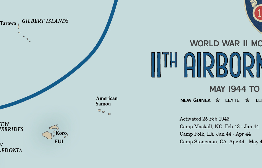 The 11th Airborne division was activated at Camp Mackall, N.C., Feb. 25, 1943 with Maj. Gen. Joseph M. Swing as the commanding officer. After a year of training in the U.S., the 11th Airborne arrived in New Guinea in May 1944 and continued their training, leaving for the Philippines in November 1944. The division landed amphibiously on Leyte 18 November 1944.
