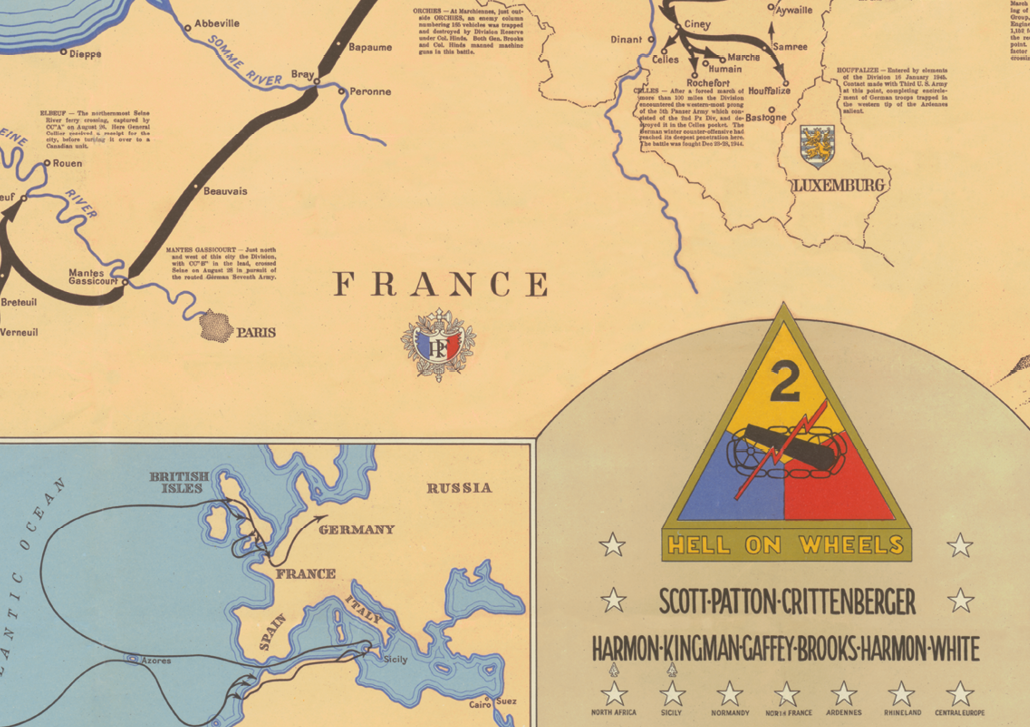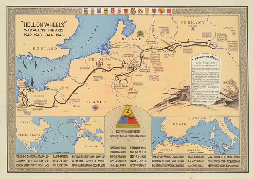 "Hell of Wheels" is a beautiful World War II route map of the 2nd Armored Division’s advance from North Africa to Sicily and across Europe from Normandy to Germany. The print comprises three maps: the largest map shows the 2nd Armored Division's route throughout Europe and identifies the location of important activities. At the bottom, two smaller maps follow the division's route from the U.S. across the Atlantic Ocean to North Africa to Sicily and finally through Europe. Printed text inset in the large map describes the history of the division.