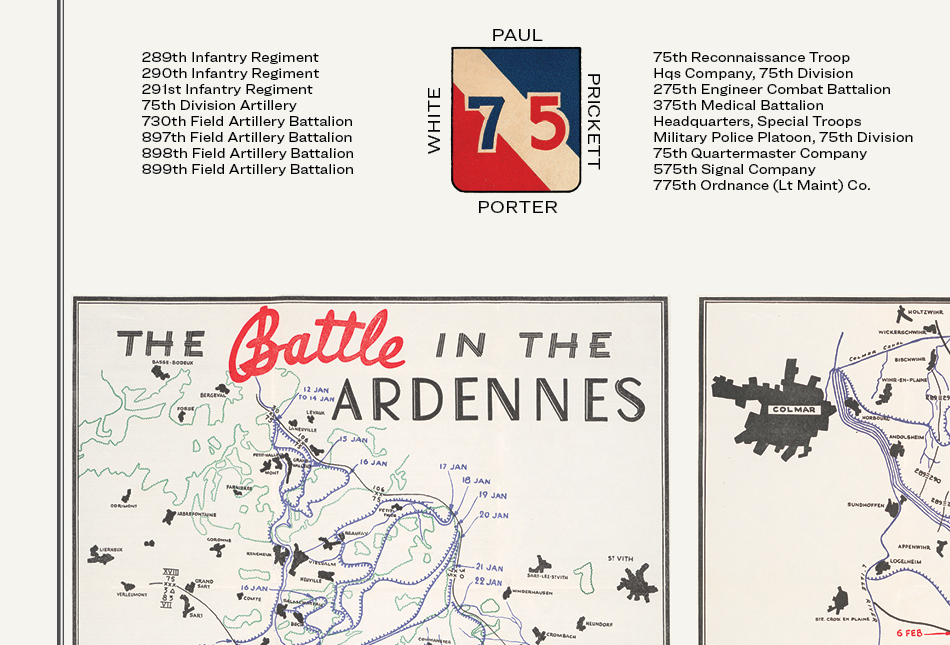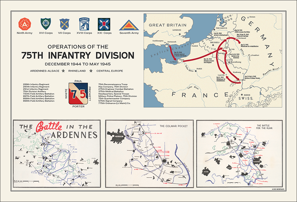 At the top right, an overview map of the division's path through Europe is provided. The bottom section contains three vintage maps detailing the most important engagements of the 75th: the Ardennes, the Colmar Pocket and the Ruhr.