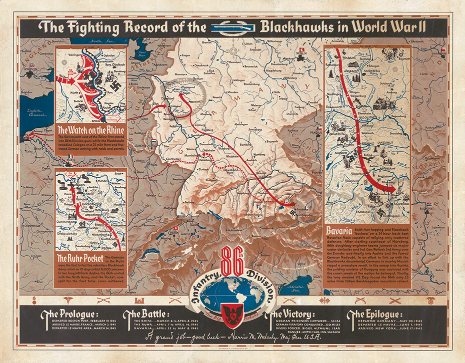 The 86th Infantry Division, known as the Black Hawk Division, arrived in France on 1 March 1945. The division spent 34 days in combat on the Western front during World War II and fought in the Central Europe campaign.