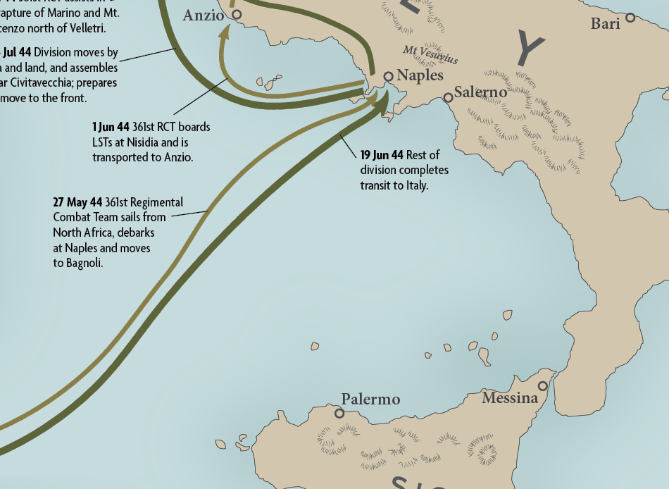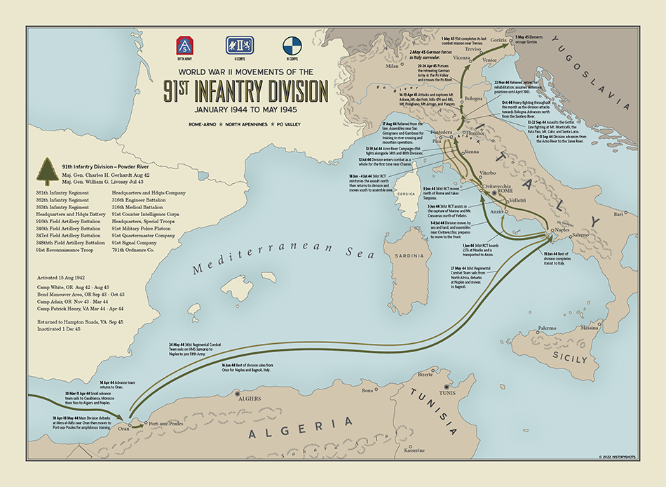 This battle and operations route map charts the journey of the 91st Infantry Division during World War II. It was designed and created by Larry Gormley in order to honor and preserve the history of U.S. service members.