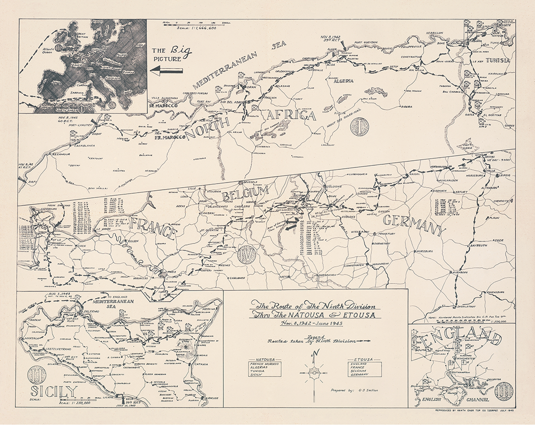 The 9th Infantry Division, known as The Varsity, saw its first combat in the North African invasion on 8 November 1942. The division spent 304 days in combat in both the Mediterranean and European Theaters.