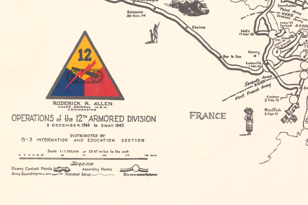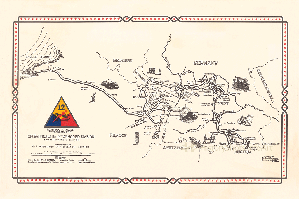 This battle and operations route map charts the journey of the 12th Armored Division during World War II. The 12th Armored Division arrived at Le Havre, France on 11 November 1944 and spent 102 days in combat on the Western front during World War II. In addition to fighting in North Africa, the division fought in the Rhineland, Ardennes-Alsace and Central Europe campaigns.