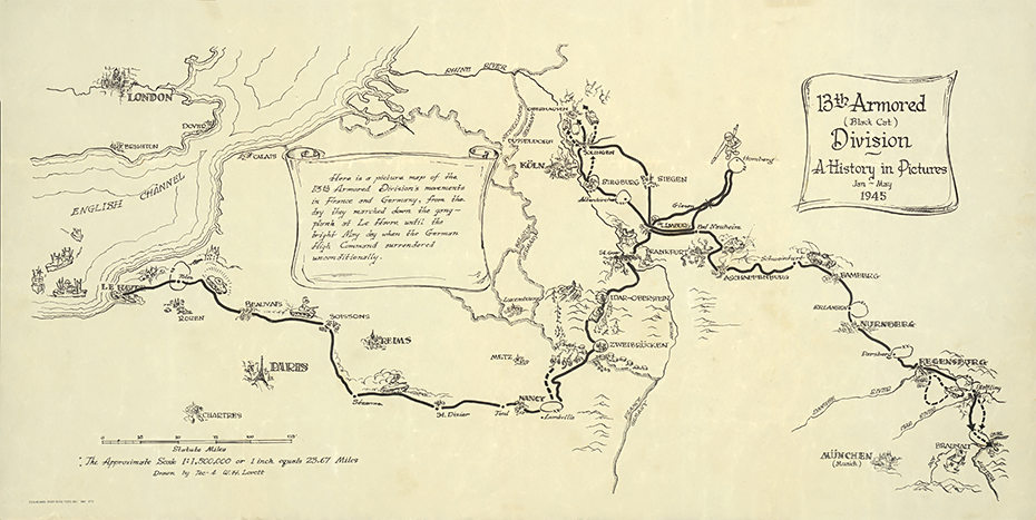 This battle and operations route map charts the journey of the 13th Armored Division during World War II.