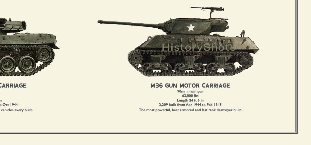 Five beautifully hand-drawn illustrations detail the evolution of US tank destroyers of World War II. Included are the first stopgap tank destroyers M3 75mm Gun Motor Carriage (GMC) and M6 37mm GMC; the first purpose-built tank destroyer M10 3-inch GMC; the fastest armored tracked vehicle of the war, the M18 Hellcat; and the M36, the most powerful US tank destroyer.