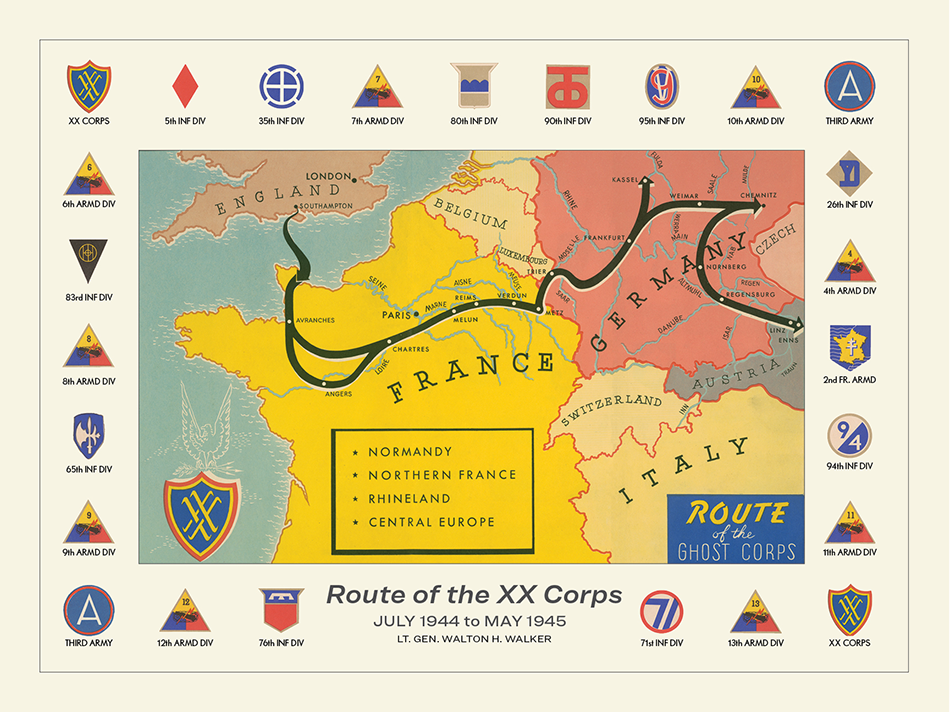 Known as the "Ghost Corps" because of the speed of its advance, the XX Corps was led by Lt. General Walton H. Walker. The XX Corps landed in France in July 1944 as part of Lt. General George S. Patton’s Third Army and fought across France and Germany. This print shows the route of the XX Corps and its assigned and attached units.