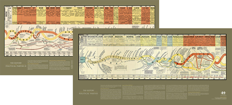 Charting the flow of political power, this History of the Political Parties prints translates our complete political history over the past 230 years into a single visual picture. Starting from a single source, a large stream representing the political parties forks and rejoins as parties are created and then fade away. These graphics provide a fascinating visual history from presidents George Washington to Donald Trump.