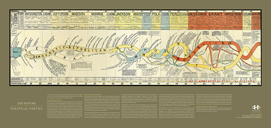 Charting the flow of political power, this History of the Political Parties print translates the first 100 years of our political history into a single visual picture. Starting from a single source, a large stream representing the political parties forks and rejoins as parties are created and then fade away. The streams twist and turn as power shifts from one party to another. Follow the history of the Loco Focos, Barnburners, Hunkers, Silver Grays, and the Temperance party. See the chaos of the 1850s as the Whig party explodes and the Republican party is born.