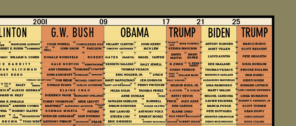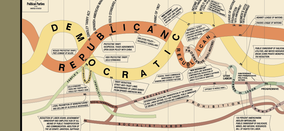 Charting the flow of political power, this History of the Political Parties II print translates the last 125 years of our political history into a single visual picture. At the center, the multiple streams representing the political parties fork and merge as parties are created and then fade away. The streams twist and turn as power shifts from one party to another. Follow the history of the Socialists, American Independents, Libertarians, Greens and United We Stand party. See the results of the notable independent elections of 1912, 1968 and 1992.