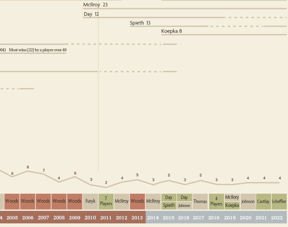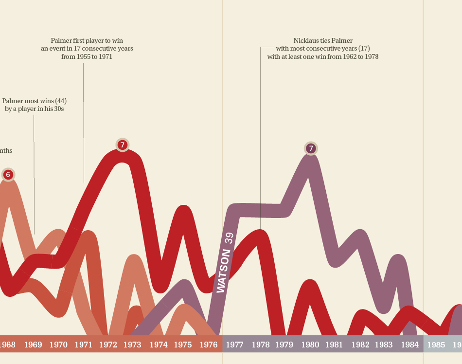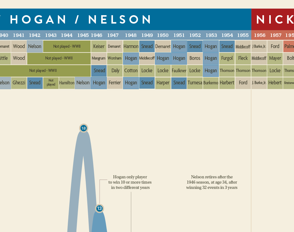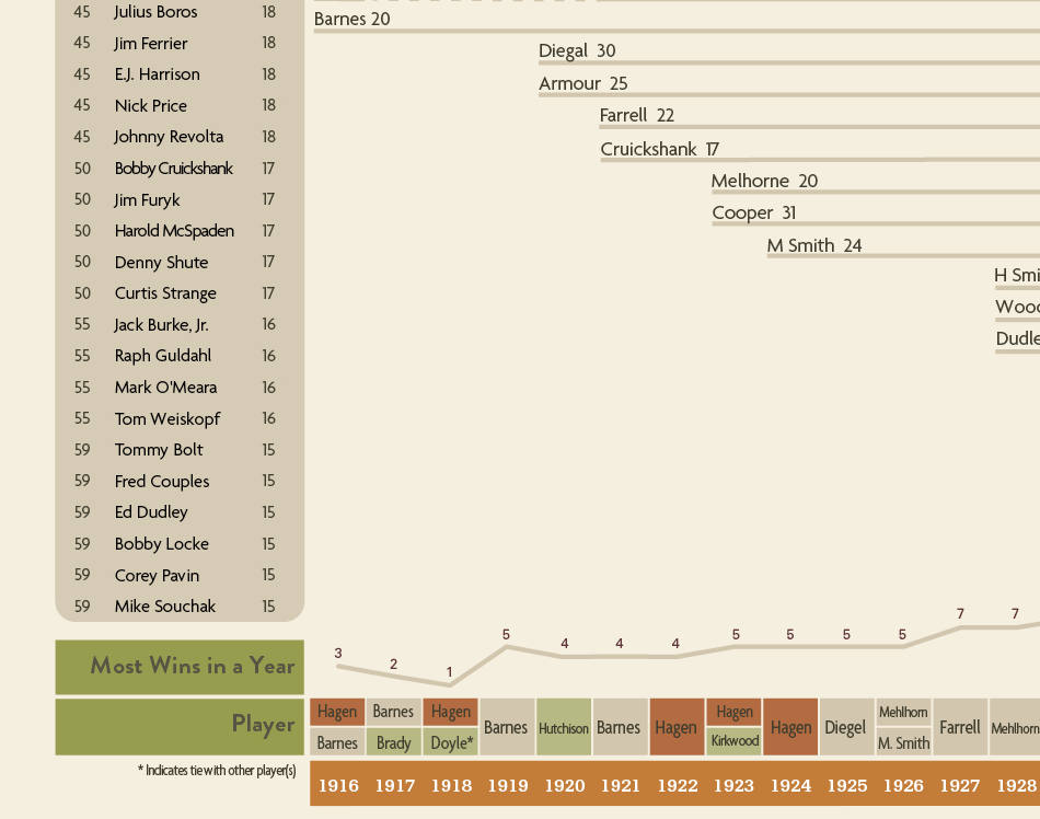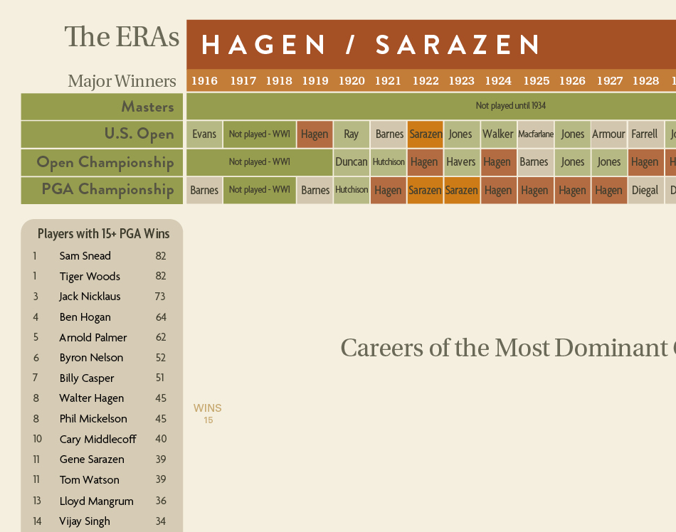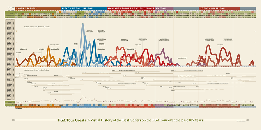 A 105-year visual history of the greatest golfers on the PGA Tour. Includes the best sixty-five players who have each won at least fifteen PGA Tour events.