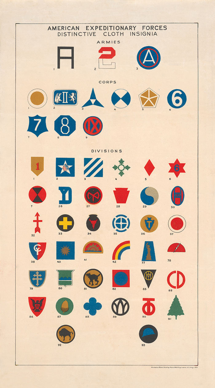 Displays the insignia of the armies, corps and divisions of the US Army in World War I. Each unit is represented by a full color badge that was worn on the uniform by soldiers of that unit. The various symbols and letters found on the badges often represent short histories of each unit. (Original title: American Expeditionary Forces Distinctive Cloth Insignia.)
